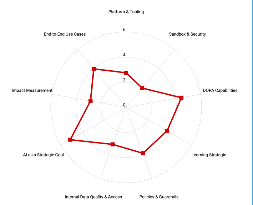 Report herunterladenWie gut schneidet mein Team beim Thema GenAI im Software-Engineering im Vergleich zur Industrie ab? Genau dafür haben wir eine kompakte Selbstevaluation entwickelt: Neun Aussagen, drei pro Dimension. Kein umfangreicher Assessment-Prozess, sondern ein ehrlicher Blick in den Spiegel – der in der Regel weniger als fünf Minuten dauert, aber erstaunlich viel offenlegt.