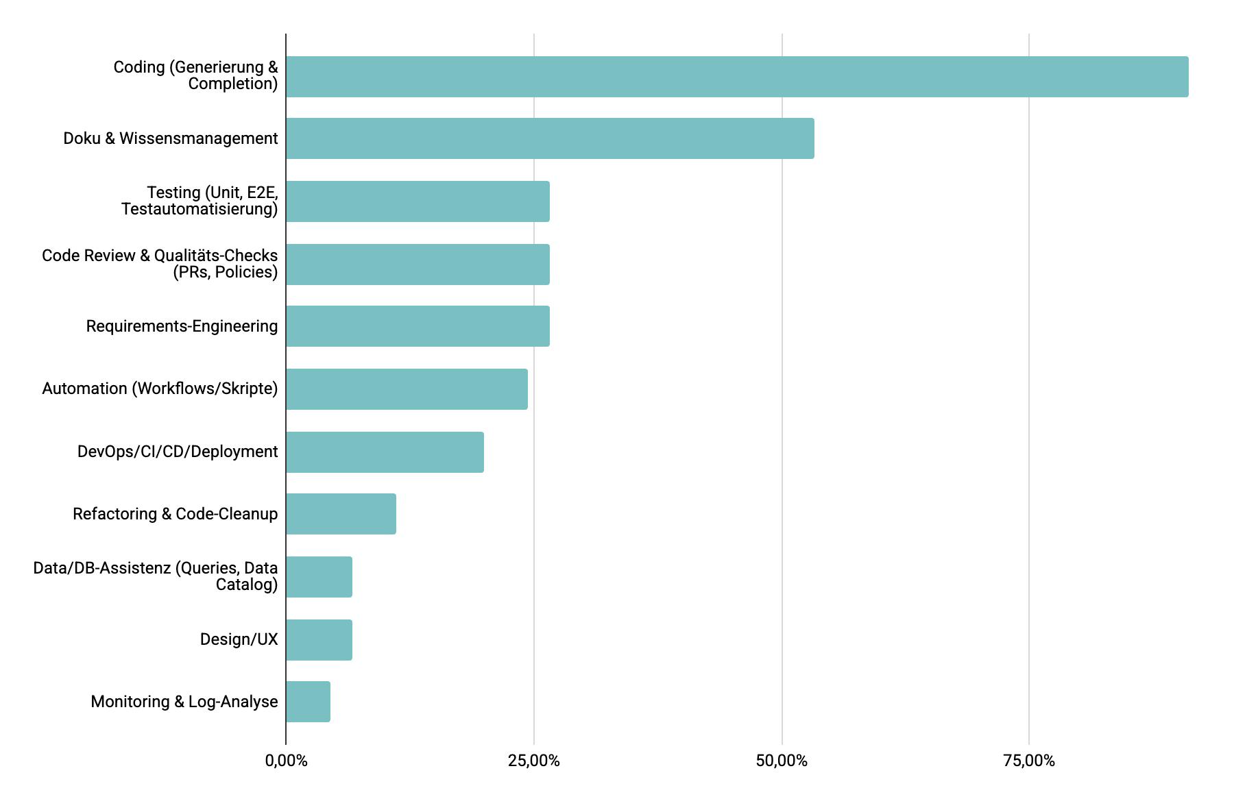 Die weiteren Anwendungsfälle liegen deutlich hinter den ersten beiden Plätzen zurück. Was aber keinesfalls bedeuten muss, dass sie je nach Unternehmen weniger relevant sind. Ein Gesprächspartner berichtet, dass für die Erstellung von Reportings im Zusammenhang mit öffentlichen Fördergeldern früher regelmäßig 3 Arbeitstage aufgewendet werden mussten. Durch die Zuhilfenahme von KI sind es nun ca. 3 Stunden. Die freigewordene Zeit wird für den gern der Tätigkeit genutzt: das Programmieren selbst.